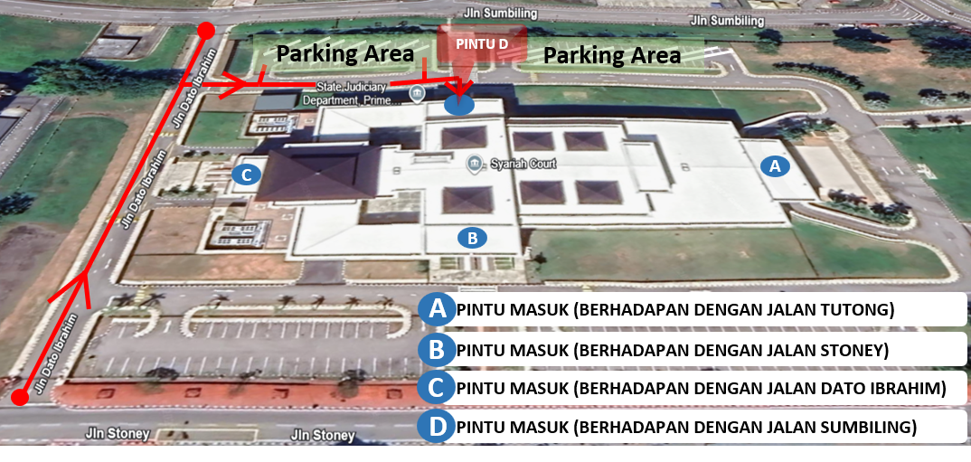 Kaunter Pentadbiran Jabatan Kehakiman Negara berada di pintu masuk Bangunan Mahkamah Besar Brunei dan Mahkamah-Mahkamah Syariah yang berhadapan dengan Jalan Sumbiling. Sila rujuk imej di atas.